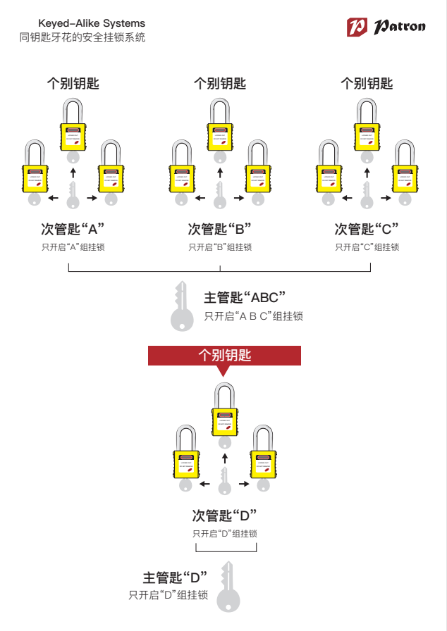 在上鎖掛牌項(xiàng)目中, 使用合適的安全掛鎖鑰匙系統(tǒng)能提升正確的人員在維護(hù)期間使用設(shè)備的管理水平。為此, 鉑鉺盾(Patron)提供一套完善的安全掛鎖鑰匙系統(tǒng), 讓項(xiàng)目參與者事半功倍。