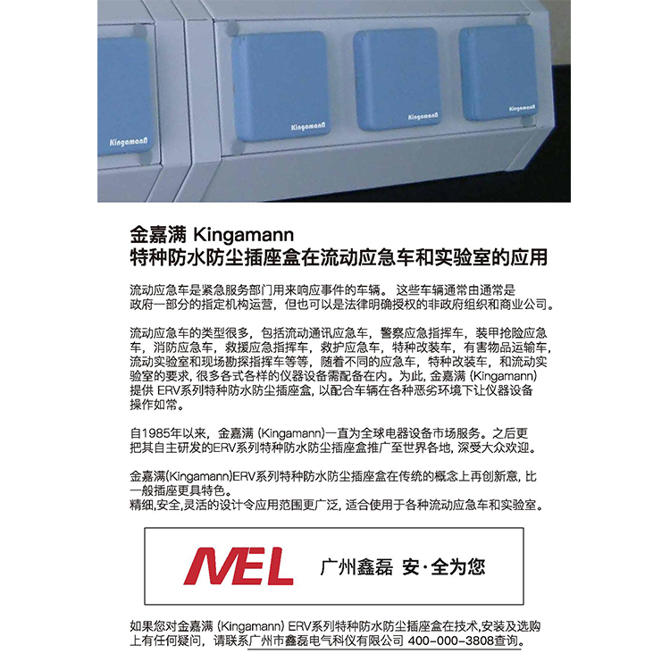 隨著不同的應(yīng)急車,特種改裝車,和流動(dòng)實(shí)驗(yàn)室的要求, 很多各式各樣的儀器設(shè)備需配備在內(nèi)。為此, 金嘉滿Kingamann提供 ERV系列特種防水防塵插座盒, 以配合車輛在各種惡劣環(huán)境下讓儀器設(shè)備操作如常。